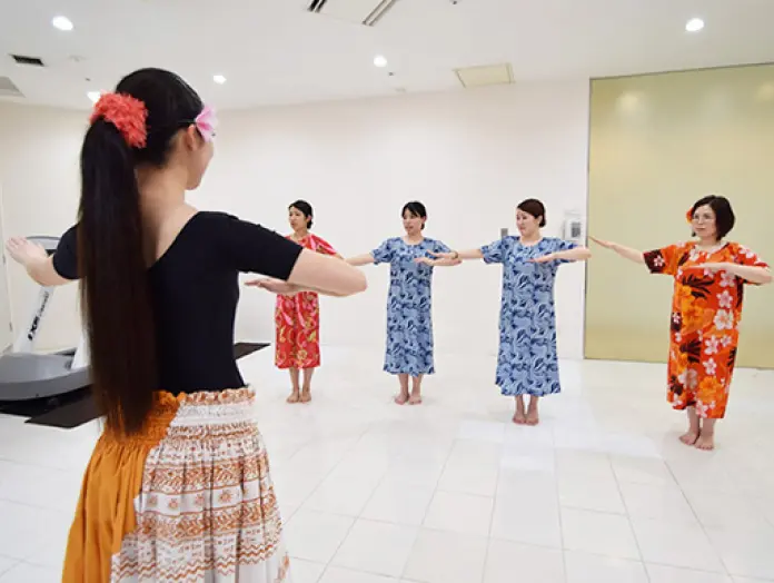 タヒチアンダンスの基本ステップに手の振りを加え、リズミカルなタヒチの音楽にあわせて楽しく体を動かし気分がスッキリ。※女性向けプログラムの為、男性はご利用頂けません。