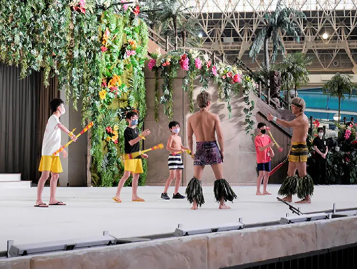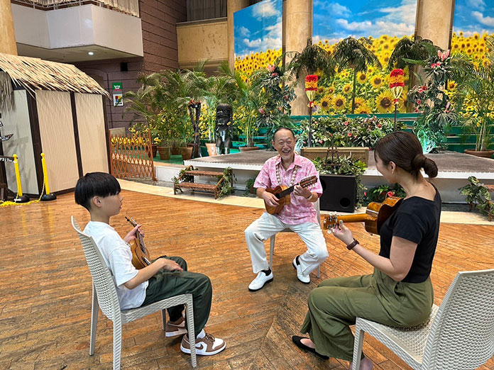 ハワイアンズのショーを支えるハワイアンバンド「エテネタヒチアンズ」のメンバーと一緒にウクレレ体験ができます。ウクレレは初心者でも気軽に楽しめ、優しい音色で癒しの効果もある楽器です。