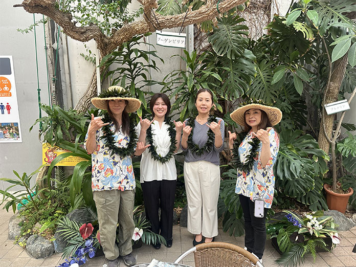 ハワイで本格的なレイの制作を学んだインストラクターがレイのメイキングをレクチャーします。いわきで生産された南国の植物【ティーリーフ】を利用した生レイです!