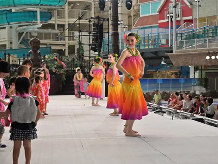 毎日のお昼と夜のショーの中には、小学生以下のお子様を対象に、ステージでダンサーと踊ることができるコーナーがあります。参加してくれたお子さまには紙レイをプレゼント!