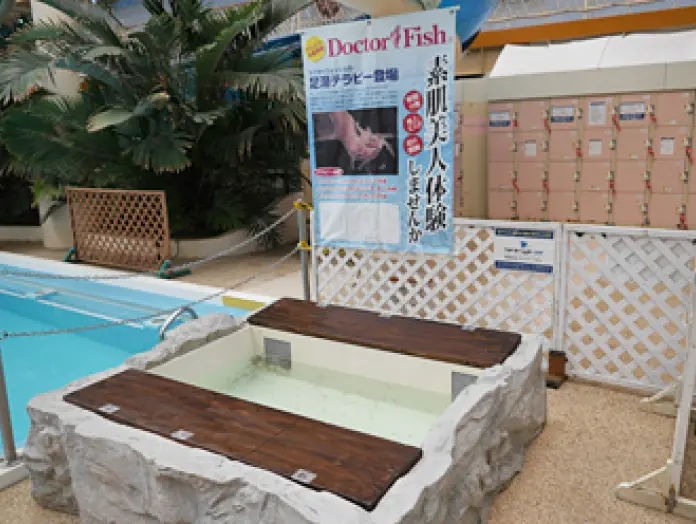足の古い角質をついばんできれいにしてくれるドクターフィッシュ。プールサイドにあるのでお気軽にどうぞ!