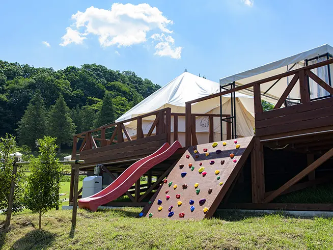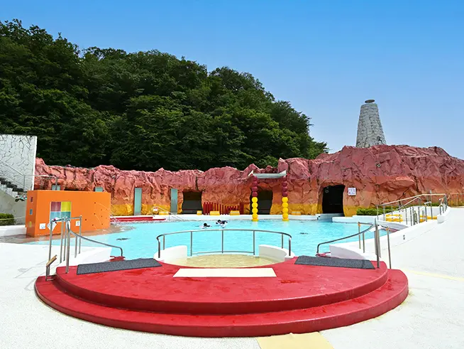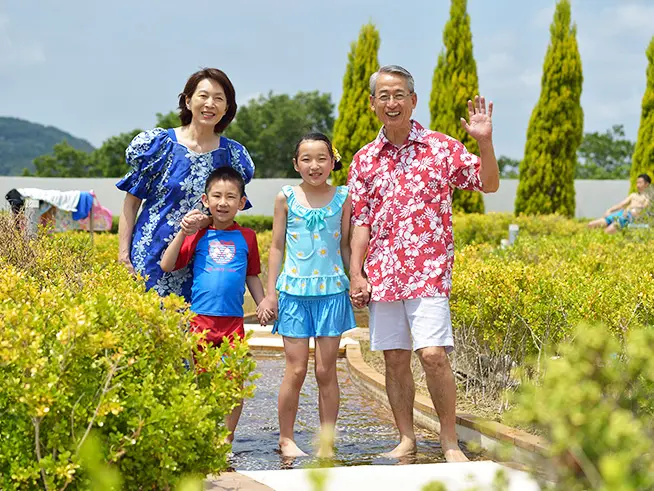 陽光を浴びながら水着で楽しむ屋外温泉ガーデン。青・赤・黄の3原色と、自然の色である緑の4つのカラーゾーンから構成されるアートスパです。