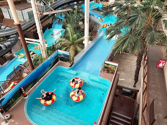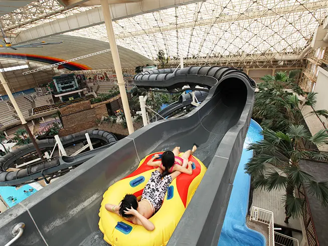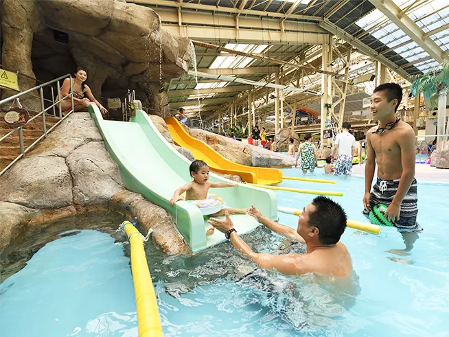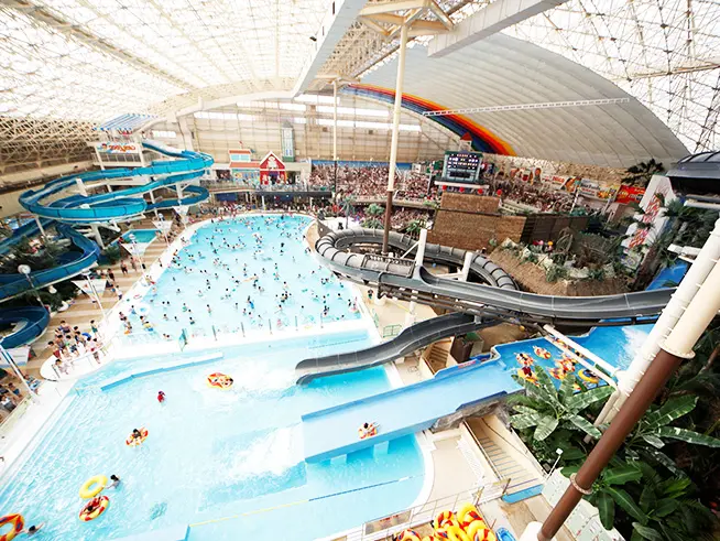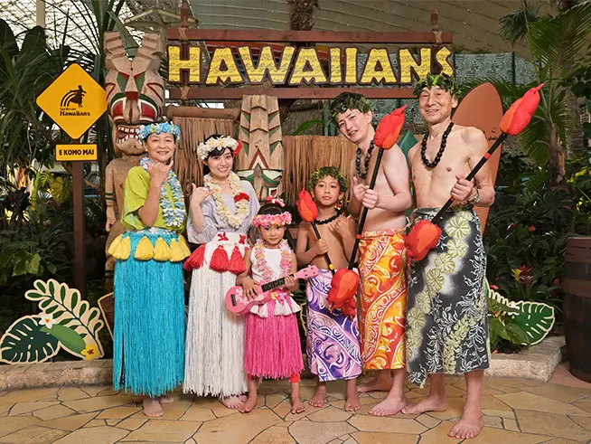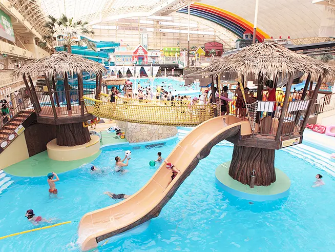 南国ムードの全天候型大ドームは、椰子の木と水に覆われた常夏のパラダイス。スライダーでスリリングに水と遊んだり、美しく情熱的なポリネシアンショーが満載です。