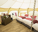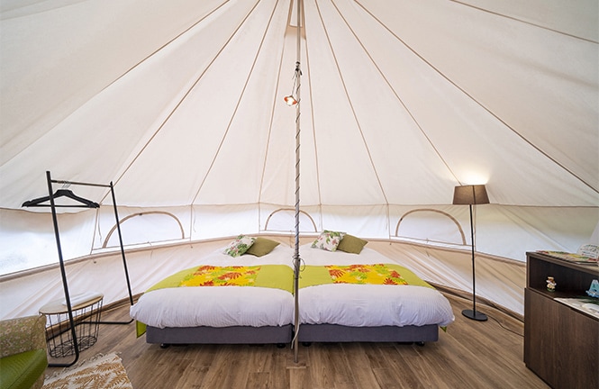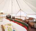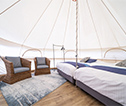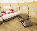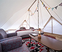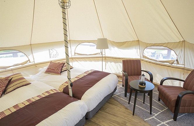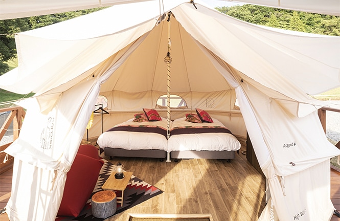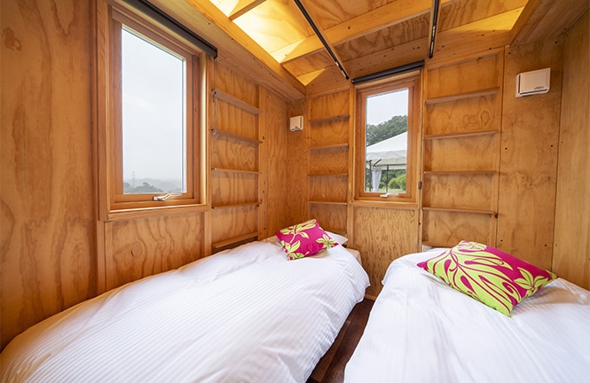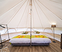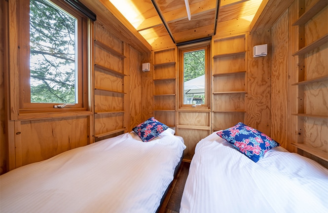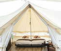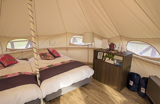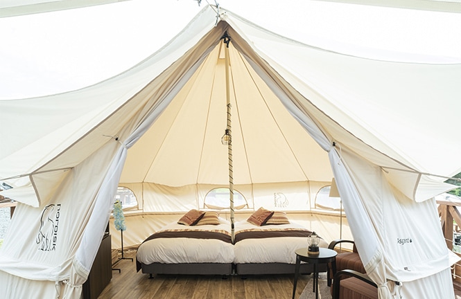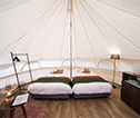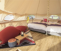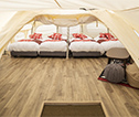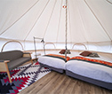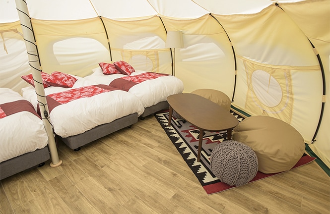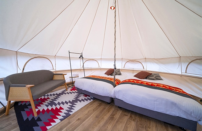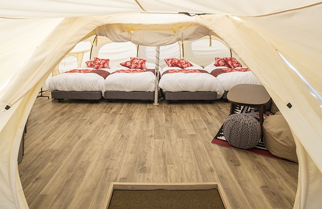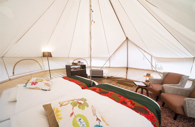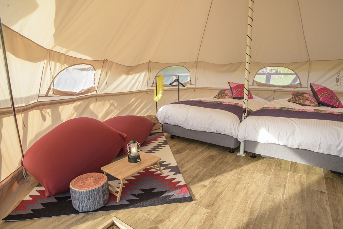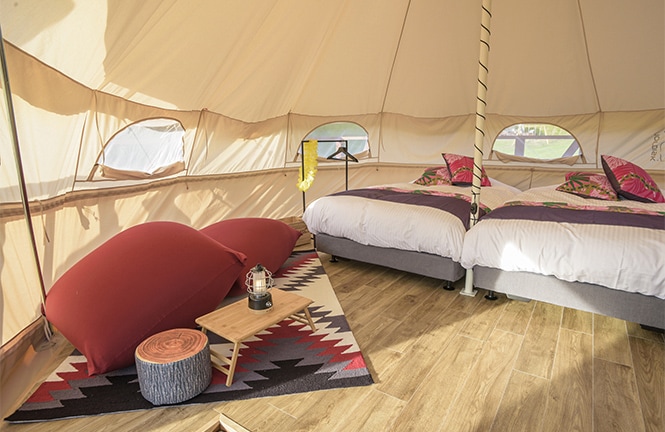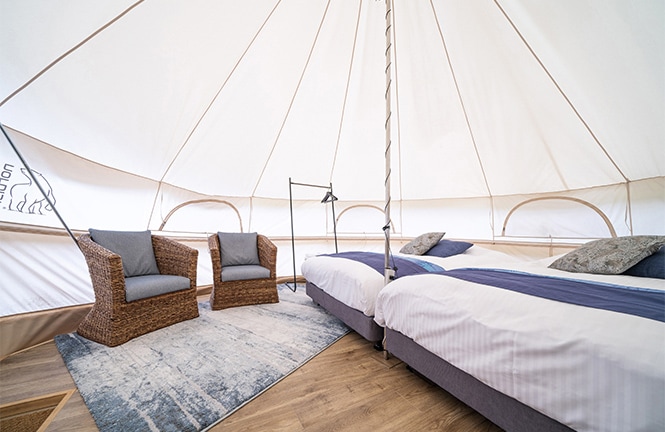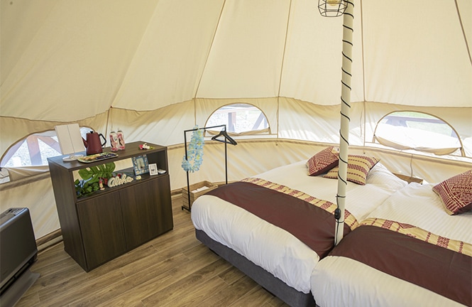 ぽてぽてとした玉ねぎ型のフォルムのテント内には、ベッド4台が並べられ、グループやファミリーでゆったりとお過ごしいただけます。