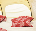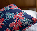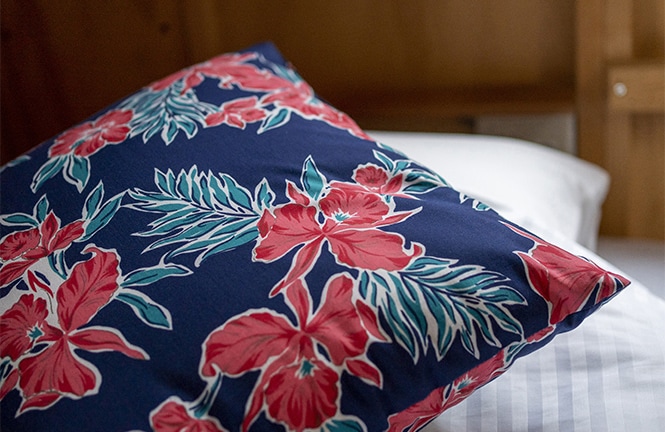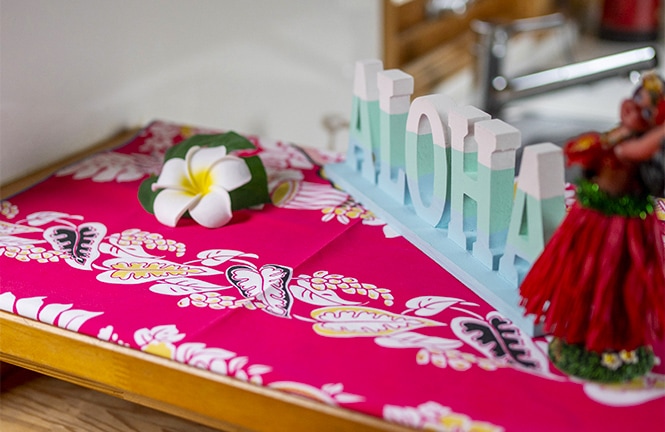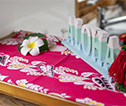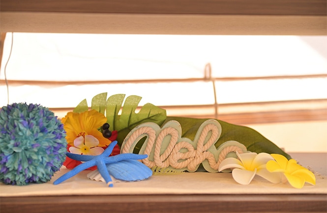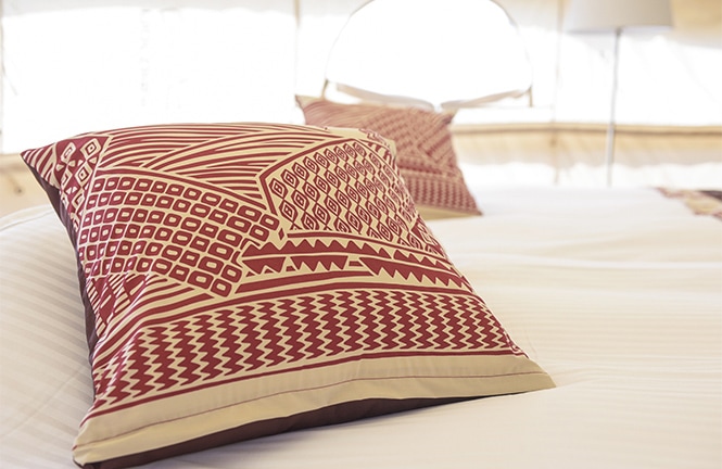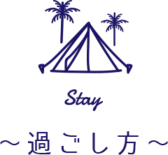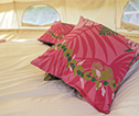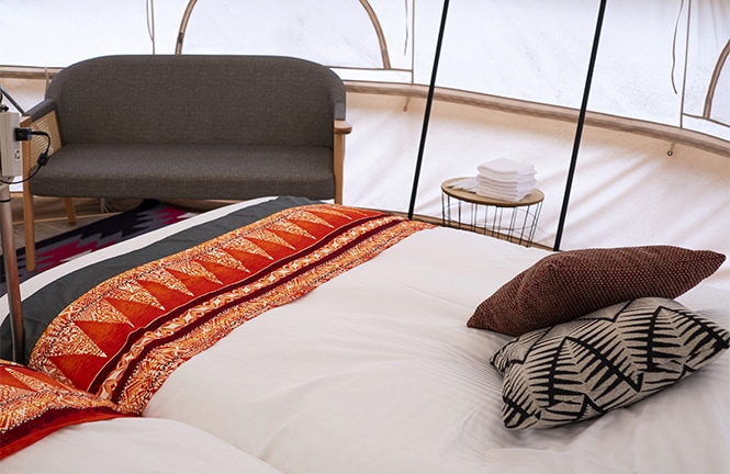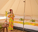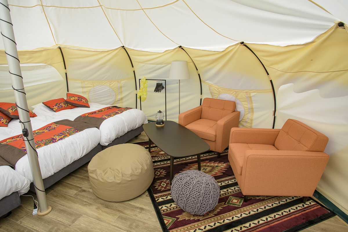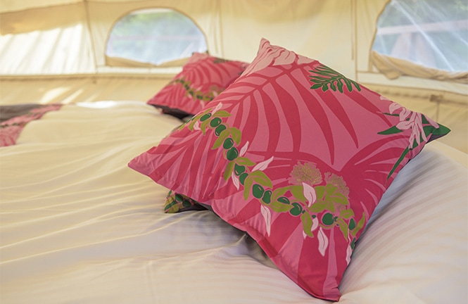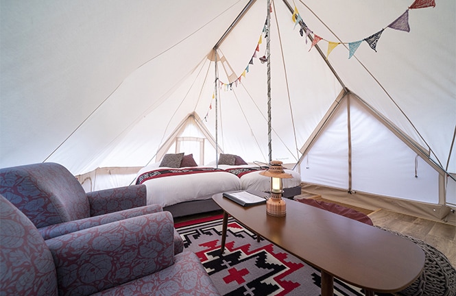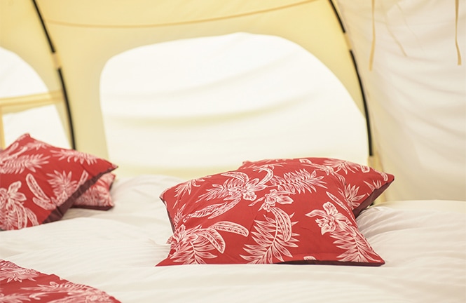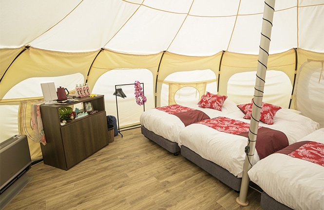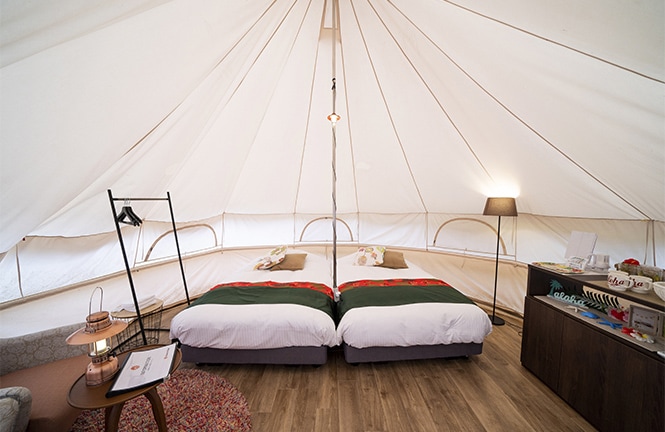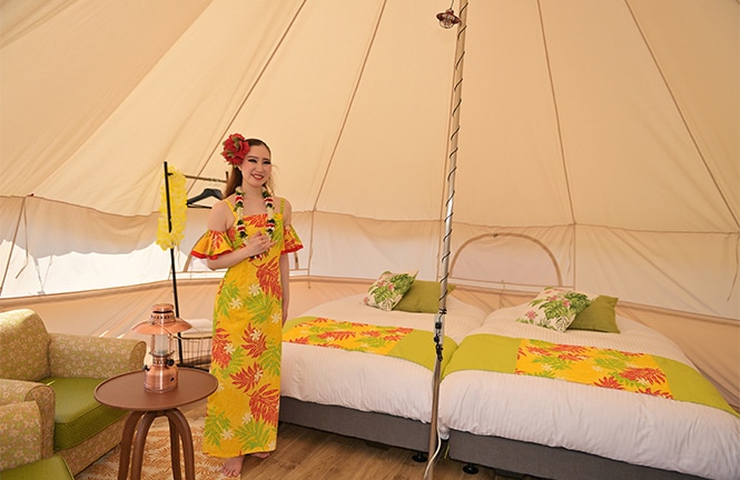 テントキャンプの醍醐味はそのままにフラガールのステージ衣装と同じデザインを取り入れたこだわりの内装。