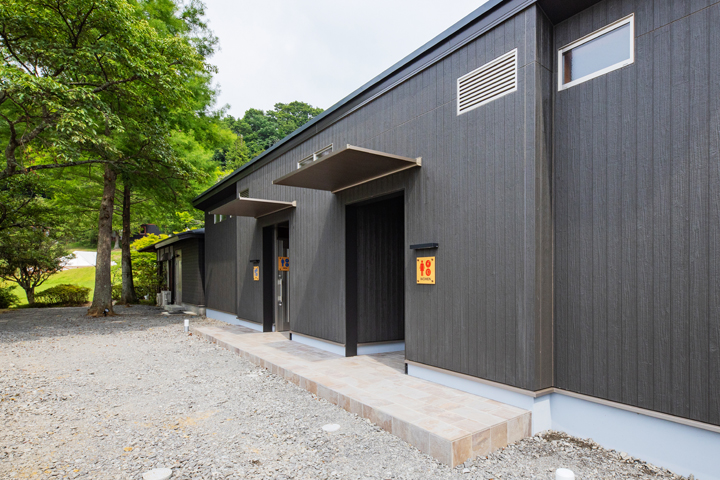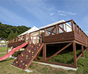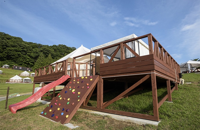 丘の斜面を利用し束建したウッドデッキに、こども用ボルタリングウォールと滑り台などアスレチック設備を併設した新タイプのテントです。
