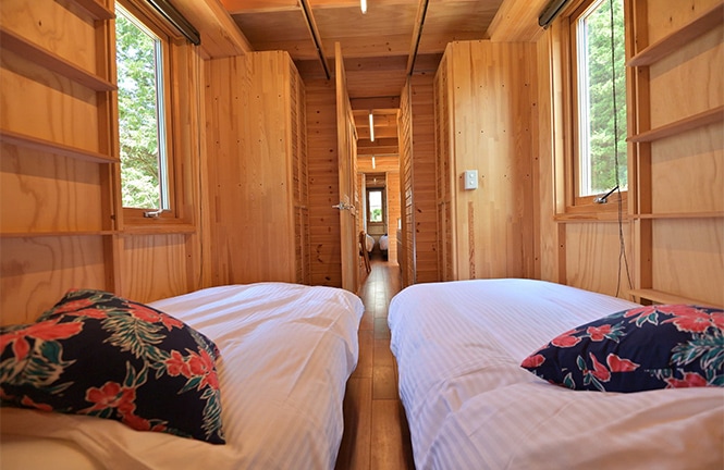 一人で寝られる場合は是非、寝袋の体験をおすすめします。キャビンはベッド2台をぴったり寄せると添い寝スペースが出来ます。