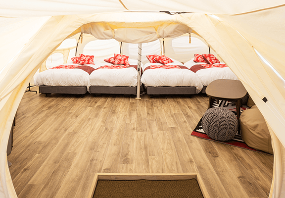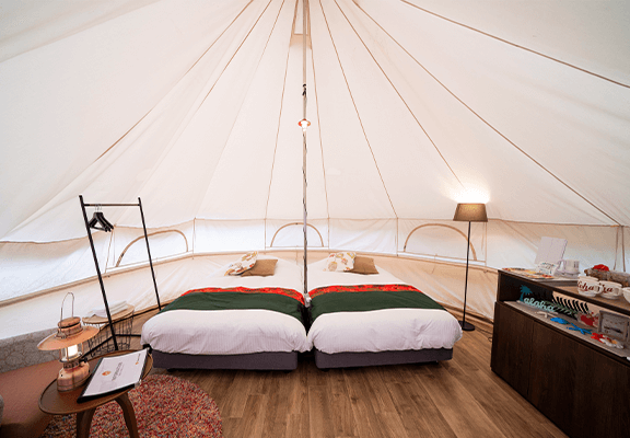 ぽてぽてとした玉ねぎ型のフォルムのテント内には、ベッド4台が並べられ、グループやファミリーでゆったりとお過ごしいただけます。