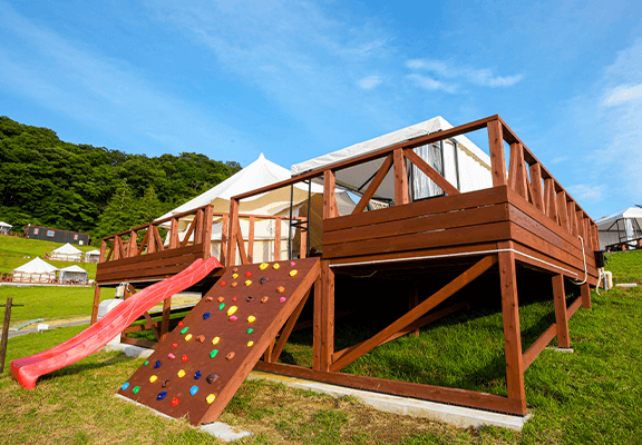 丘の斜面を利用し束建したウッドデッキに、こども用ボルタリングウォールと滑り台などアスレチック設備を併設した新タイプのテントです。