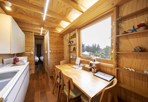 テントキャンプの醍醐味はそのままにフラガールのステージ衣装と同じデザインを取り入れたこだわりの内装。