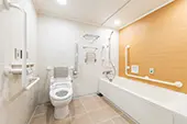バリアフリーの優しさの中で、ご年配の方も、お子様連れのお客様にも。広々としたルームレイアウトはもちろん、浴室・洗面所・トイレのサニタリースペースも車イスで利用できるユーティリティを確保。すべてのお客様に安全で快適なホテルライフを約束する、優雅で機能的なゲストルームです。